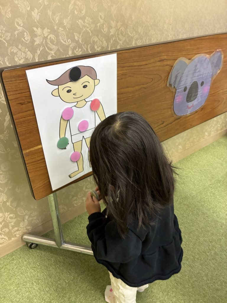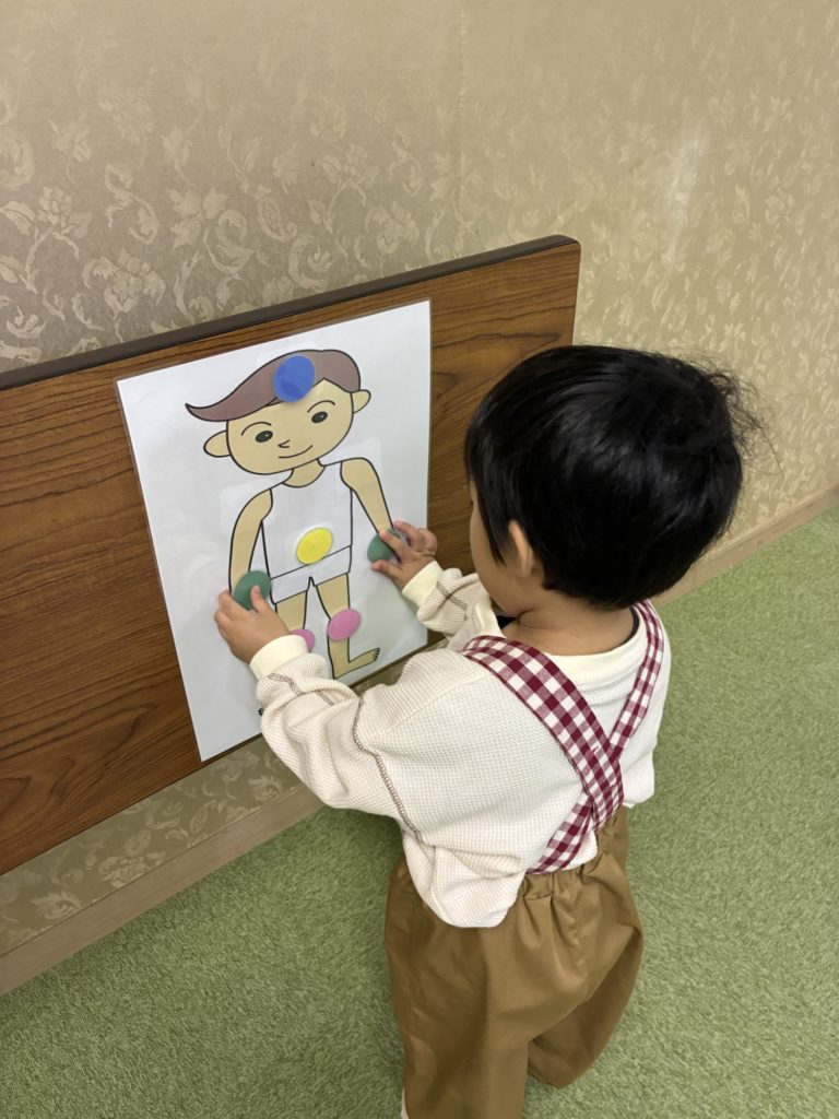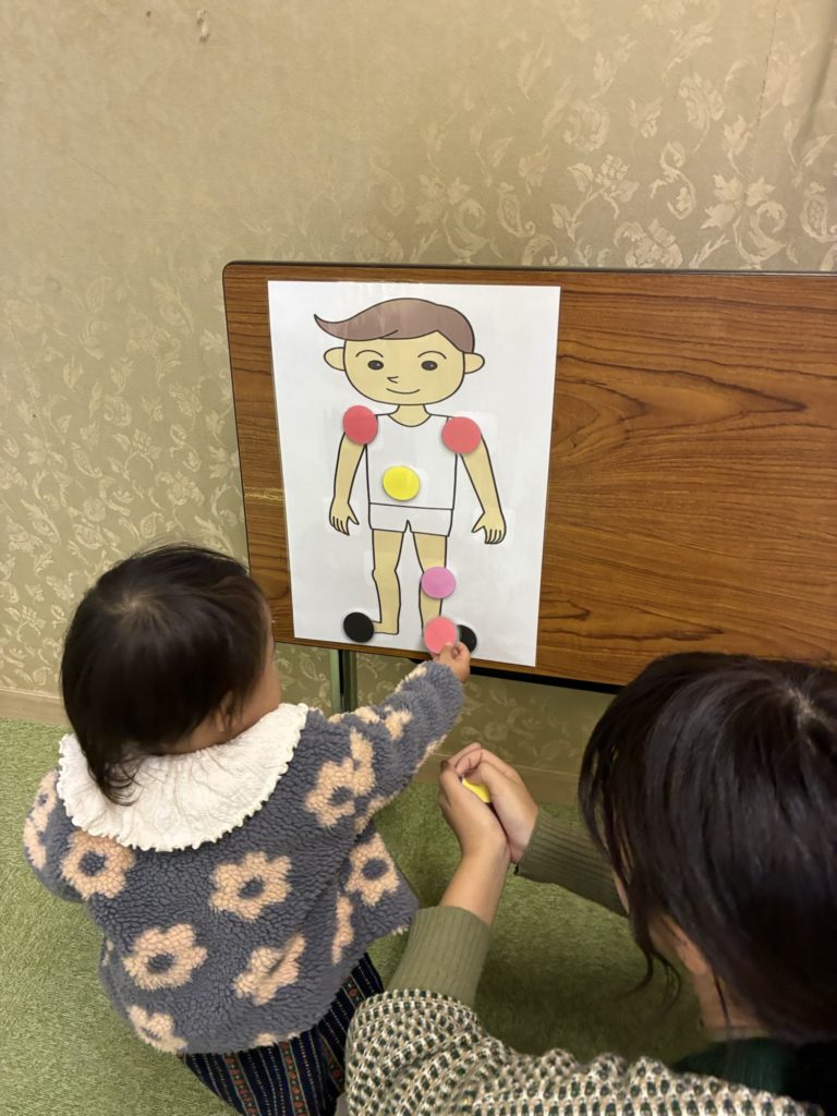 頭、肩、手、お腹、お膝、足など、体のパーツの英語を使って、シールをペッタンしました!